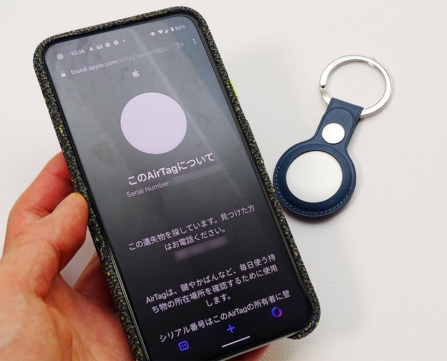 誰かが紛失したものと思われるAirTagを発見したらNFCスマホをかざすと連絡先電話番号がわかる。Android端末でもOKだ