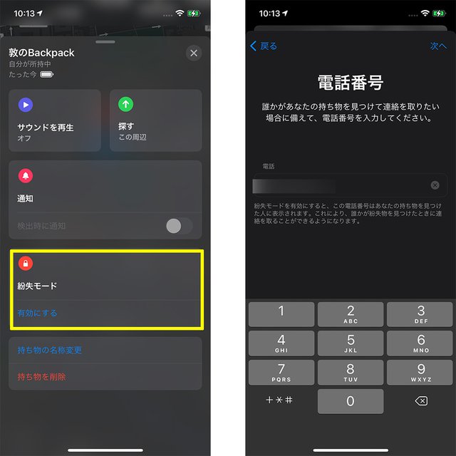 「探す」アプリから紛失モードをオンにして連絡先電話番号を登録する