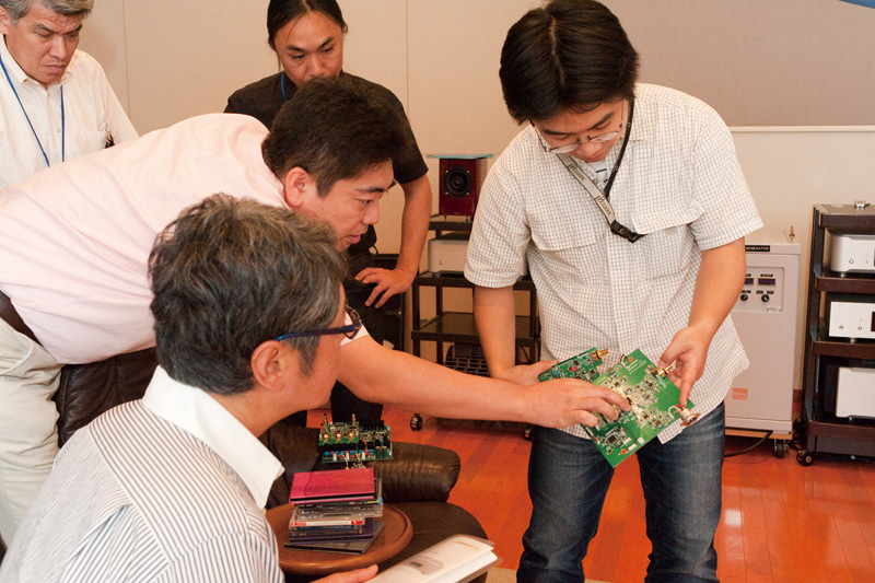 それぞれアイソレートされた回路ブロックの説明を受ける石原氏。投入された開発ポイントの多さに感心しきりであった