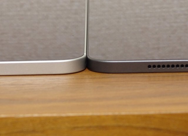 本体の厚さは新しい12.9インチiPad Proの方が0.5ミリほど厚くなっているが、手に取ってその差がはっきりとわかるほどではない。左側が新機種