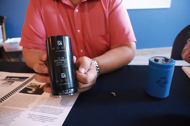 888の内部に収められているコンデンサー。写真のサイズのものが全部で12本収められている。この製品のためだけに特別にチューニングされたもの