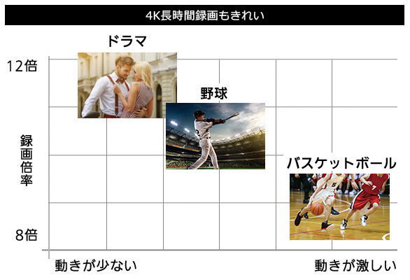 パナソニック独自のおまかせ長時間録画モードなら、4Kらしい高精細さを保ったまま、スポーツのように動きの速い映像でも破綻ないよう、録画倍率8〜12倍のあいだで自動的に最適な圧縮をかけてくれる