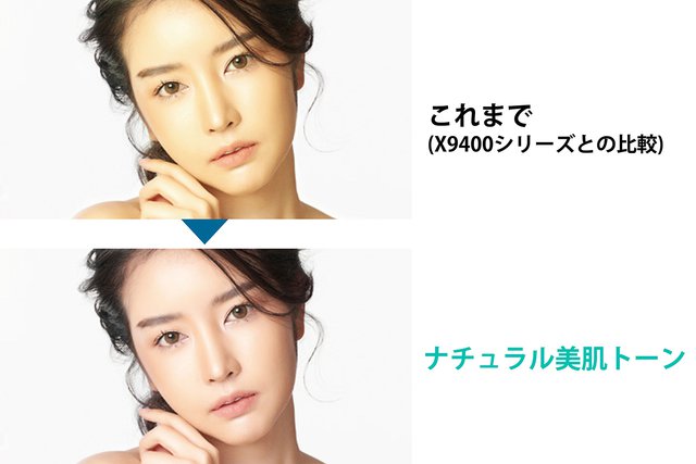 「ナチュラル美肌トーン」は、肌の色味や質感に対して高い感度を持つ人間の特性に着目し、照明の照り返しなどの撮影環境や視聴環境の影響を受けて不自然に変化した人肌の色味を補正する機能。色味だけでなく、立体感や質感を向上させる。「おまかせAI」「あざやか」「標準」の映像モードで有効になる