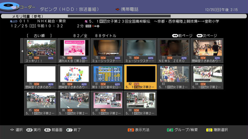 番組を選択してダビングを実行。ダビング時の番組変換には実時間の半分程度の時間がかかる
