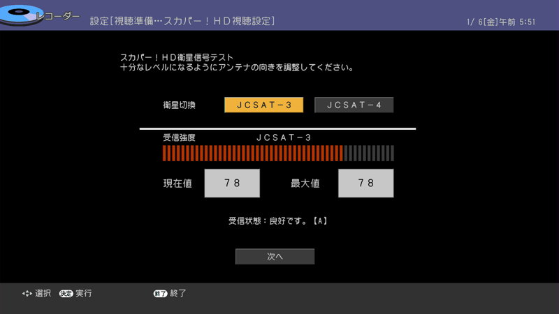 本機がスカパー!HDチューナーを兼ねるためアンテナ感度も確認