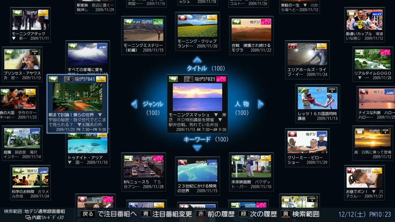 タイトルや人物、ジャンル、キーワードをもとに関連する録画番組を環状にサムネイル表示する「ローミングナビ」