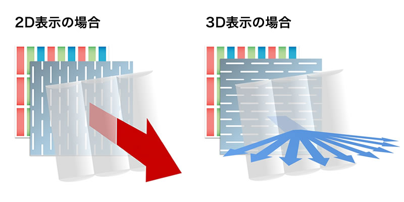 液晶パネルと前面のレンチキュラーシートの間にある偏光切替シートを制御することで「4K解像度の2D映像」と「裸眼3D映像」の両立を実現している