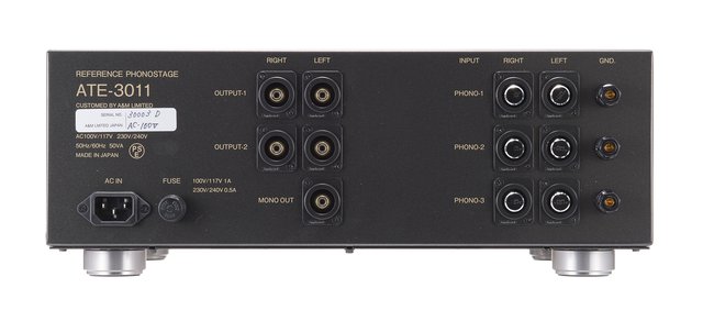 「ATE-3011」のリアパネル。入力はいずれもMM専用で、MCカートリッジを接続する場合は昇圧トランスが必要となる。また、モノラル出力が可能な「MONO OUT」を用意する