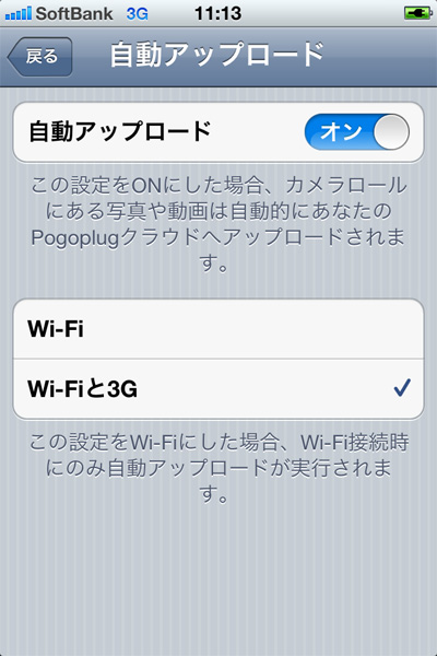 自動アップロードはWiFi単体、またはWiFi/3G併用での通信方法が選べる