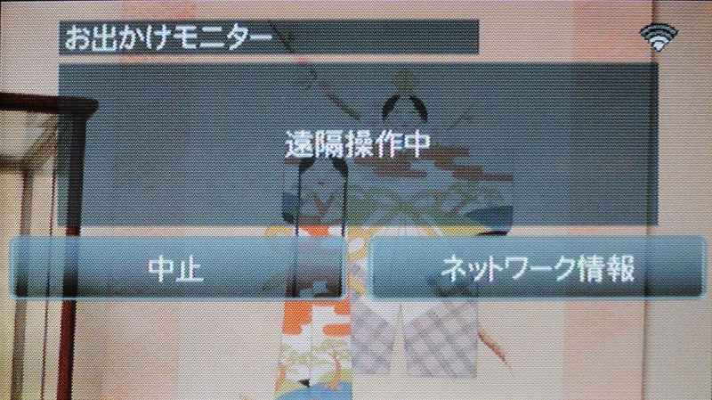 「おでかけモニター」接続中の画面。スマートフォンあるいはパソコンで遠隔操作中であることが表示されている