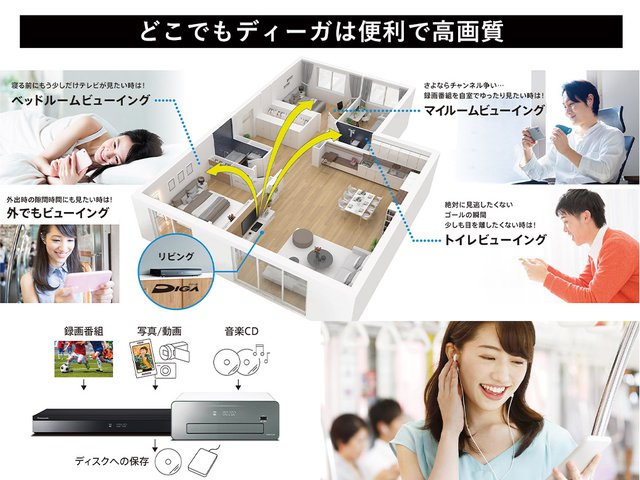 実際のユーザーからの評価も高い無料アプリ「どこでもディーガ」。スマホやタブレットで、おうちのなかで、外出先で、好きな場所へ持ち出して、ディスクに保存した録画番組や写真・音楽を楽しめるほか、リアルタイムでの番組視聴も可能。高画質のままで映像を圧縮する独自のエンコード技術もディーガならでは。帰宅時にスマホと自動接続して、持ち出し予約をしておいた録画番組を転送できる「ただいま転送」も新たに実装。お気に入りのドラマやアニメを、スマホやタブレットでも美しい画質で快適に楽しめる。