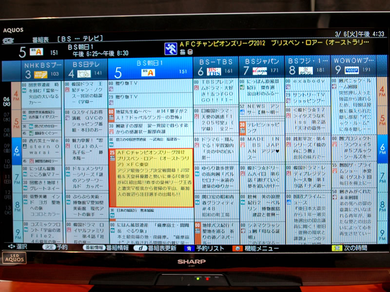 EPGを表示させたところ。録画予約済みの番組が色分けされて表示される