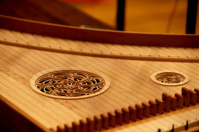 クラヴィシンバルムの響板に刻まれるサウンドホール。Persona Bを見た瞬間、このサウンドホールが頭に浮かんだという(※クラヴィシンバルムはチェンバロの前身と言われる鍵盤楽器)