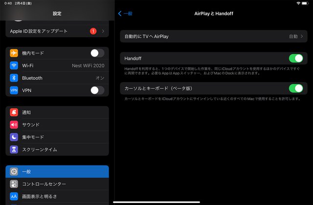 iPadOSの「設定」を開き、「一般」から「AirPlayとHandoff」を開いて「カーソルとキーボード」をオンにする