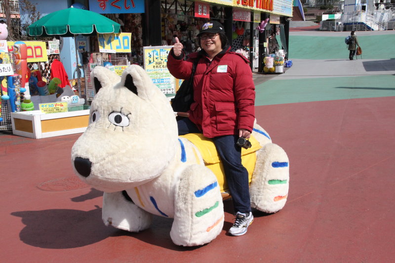 最初は余裕を見せていた一条氏。よみうりランドのキャラクター、ランドドッグに乗ってご満悦