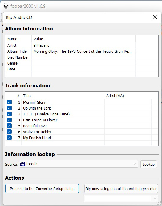 foobar2000のCDリッピング画面