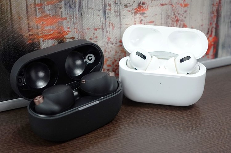 ソニーWF-1000XM4との充電ケース比較。ソニーも十分小さい。ただし、フタ部分が若干かさばる印象