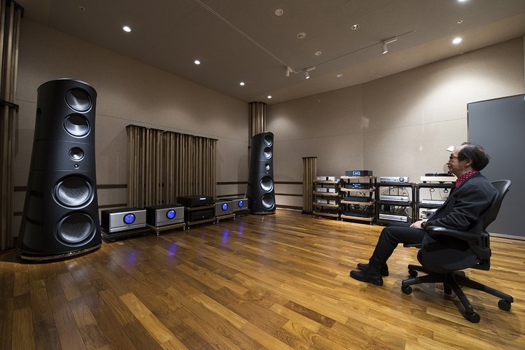 M9のサウンドに聴き惚れる角田氏。CD再生にはメトロノームの「t│AQWO」「c│AQWO」、プリアンプはPASSの「XP-32」を組み合わせ