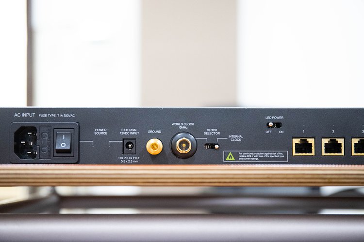 外部クロック入力でさらなるグレードアップが図れるほか、LANポート間のスペースを確保することで相互干渉を防ぐなど、さまざまな対策が施されている