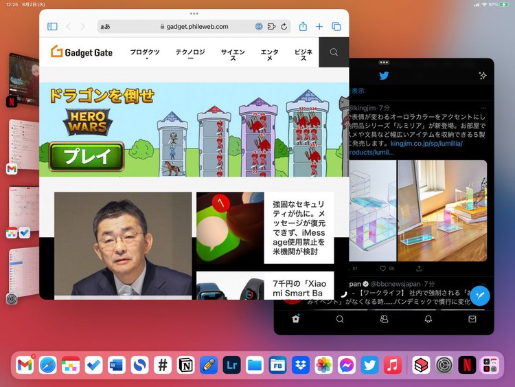 iPadOS 16の「ステージマネージャ」。Macの場合と似ているがこちらは「iPadをマルチウィンドウ環境に変える」機能だ