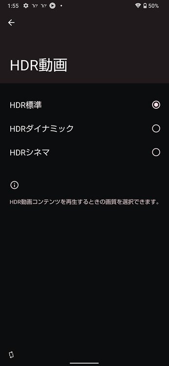 HDR動画の視聴時には、画質設定の基本設定に加えて「標準」「ダイナミック」「シネマ」も選べる
