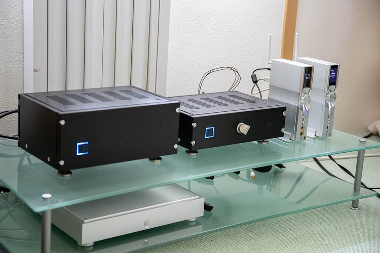 電源が別筐体のファンダメンタルのプリアンプ「LA10 versionII」を使用。ハイレゾ音源の送り出しにはfidataのHDD搭載モデル「HFAS1-HN80」