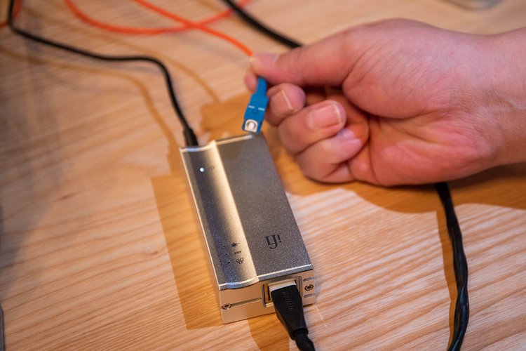 iFi audio謹製のメディアコンバーターOptiBoxが付属する。なおSFPポートではなく光ファイバーケーブルを直接挿入する