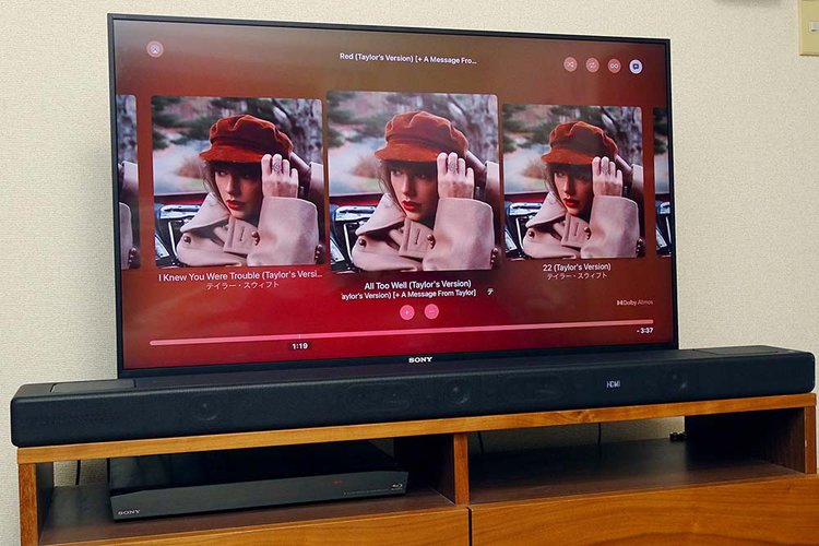 ソニーのサウンドバー「HT-A5000」でApple Musicのドルビーアトモスによる空間オーディオに対応するコンテンツを再生。ライブのような臨場感がリビングルームを満たした