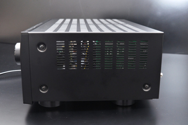 AVR-2113を側面からみたところ。内部構造を一新し、奥行きサイズを前モデルと比べて53mm短縮し、329Dmmとなっている