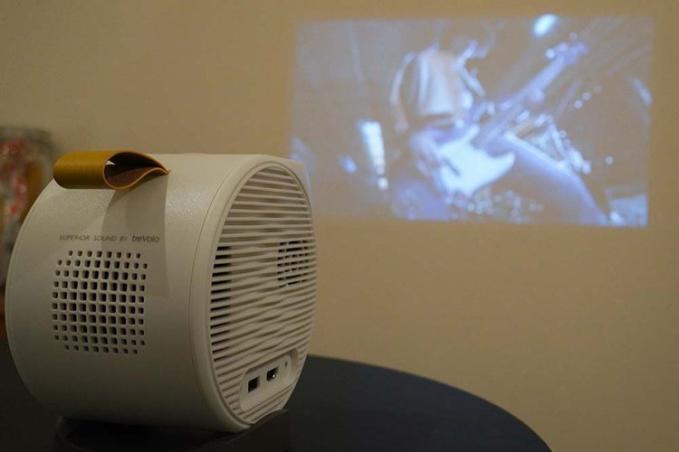 もちろん壁面投写も楽しめる。本体背面にスピーカー穴が備えられており、見た目以上のパワーでサウンドが再生される