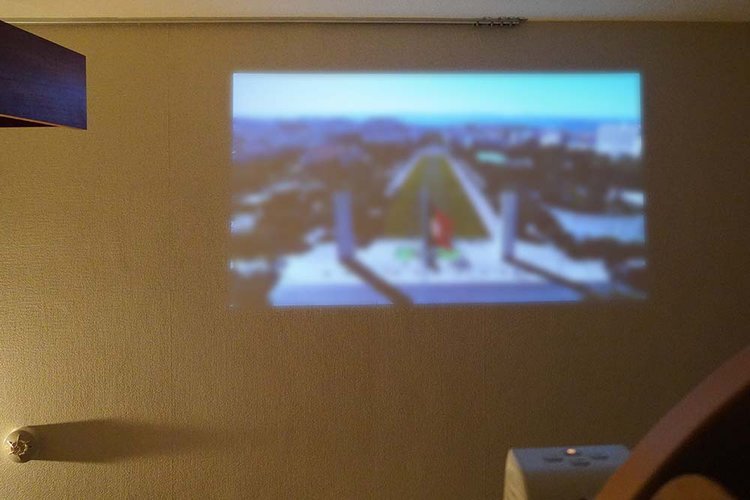 実際に天井に投写したところ。照明をつけた状態でもクッキリとした描写がされている