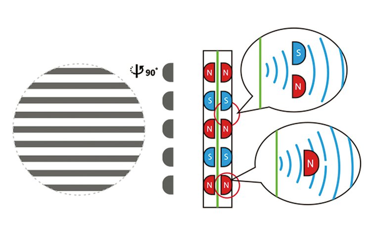 本機は棒状のマグネットを並行に配置し、振動板の両面を挟み込むようにレイアウトすることで、強力な磁力を均等に振動板へと伝える構造を採用する。そのため音(空気)が磁石間を通るのだが、その際に起こる回折現象を低減するため、磁石は丸みをもたせた独自形状となっている