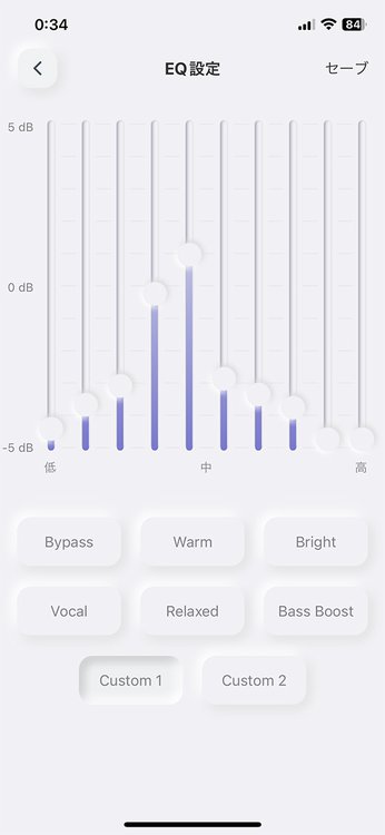 アプリ「AVIOT SOUND ME」で設定した筆者のカスタムEQ設定。ユーザーに応じた音のパーソナライズも手軽にできるのも大きな魅力だ