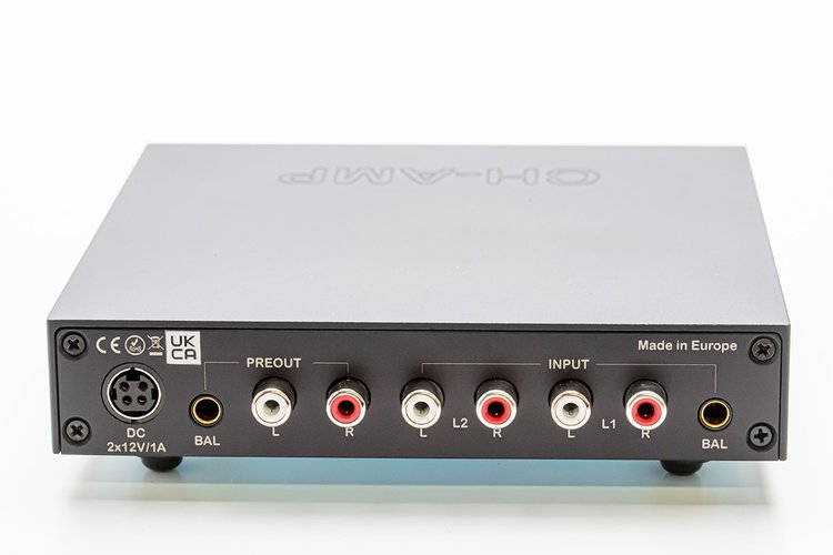 「CH-AMP」背面部。バランス、RCA1系統ずつのプリアウト出力と、入力端子としてRCAが2系統と4.4mmバランス1系統を搭載する