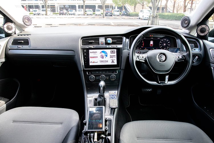 Golf Variantの車内。BLAMのフラグシップスピーカーを4ウェイで取り付けている