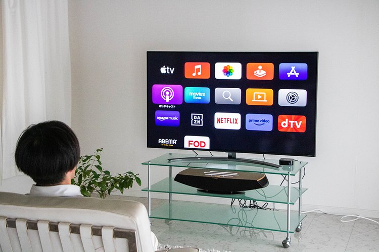 テレビのHDMI端子とOmniaを接続するだけでセットアップは完了! Apple TV 4Kなどを接続すれば、様々な映像ストリーミングサービスを高音質で楽しむことができる