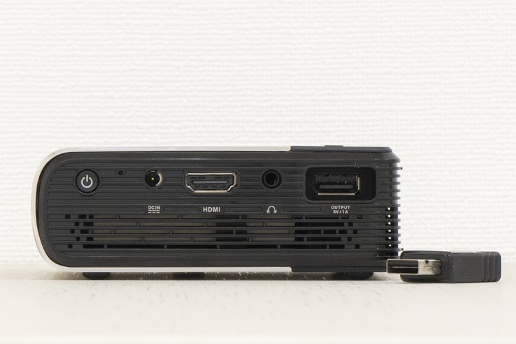 ASUS「ZenBeam E2」の端子部とWi-Fi用USBドングル