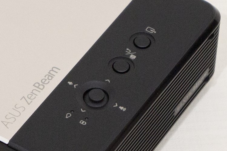 ASUS「ZenBeam E2」の天板部には、ボリューム調整、台形補正の調整、メニューボタンなどを装備