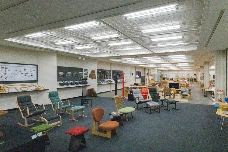 天童木工のショウルームにはソファや椅子、テーブルなどさまざまなアイテムが展示されている
