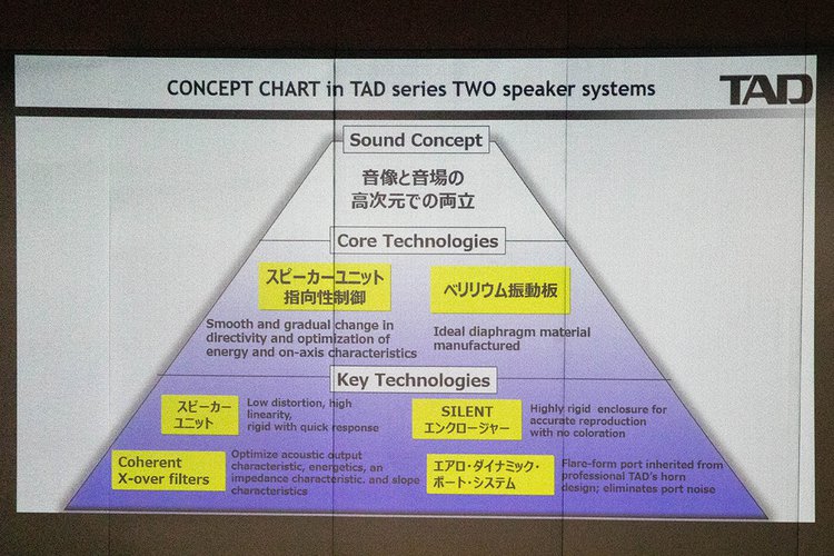 改めてTADスピーカーの開発コンセプトとこめられた技術を解説。「音像と音場の高次元の両立」という大きなキーコンセプトに向けて素材の開発や指向性のコントロールをおこなっていく。CSTドライバーとウーファーユニットのスムーズなつながりも重要