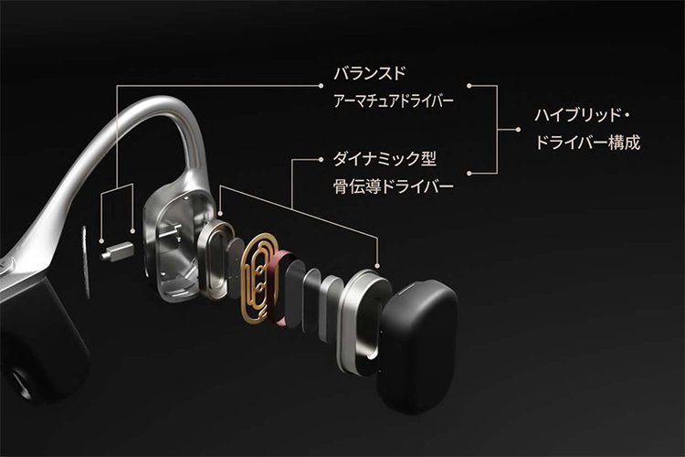 骨伝導イヤホンとしては異色の、骨伝導+BA(バランスド・アーマチュア)ドライバーによるハイブリッド・ドライバー構成を採用している