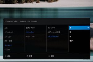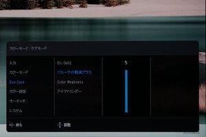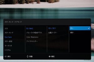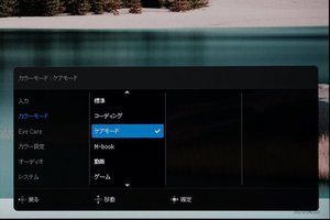 カラーモードは、「標準」「コーディング」「ケアモード」「M-book」「動画」「ゲーム」の項目を用意している
