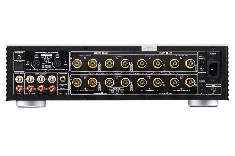スピーカー出力端子が目を惹くRA180のリア。RCAのアナログ入力を3系統、MM/MC対応(スイッチにて切り替え)のフォノ入力を1系統のほかXLRバランス端子を1系統備える。スピーカー端子部には、BTL接続用のつなぎ方もマーキングされている