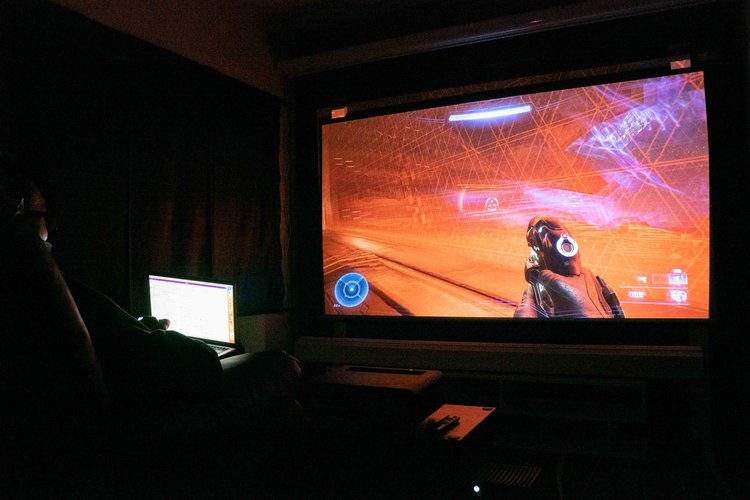 『Halo Infinite』の実際のプレイ画面をX2-4Kで投写した写真。左が暗室、右が明室