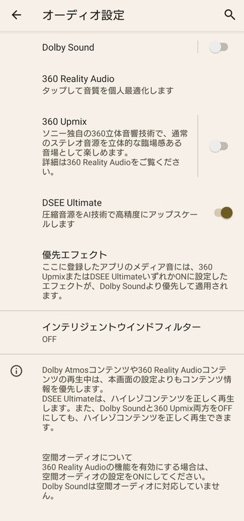 オーディオ設定から「360 Upmix」と「DSEE Ultimate」の設定が可能。オンオフして音質の違いをチェックしたい