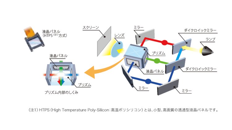 3LCD方式を採用。光源を赤・緑・青の三原色に分解し、透過型液晶を通して各色の映像をつくり、合成するので、明るく鮮やかなカラー表現が得意。方式の原理上、虹状の模様(カラーブレーキング)が見えにくいのもメリット