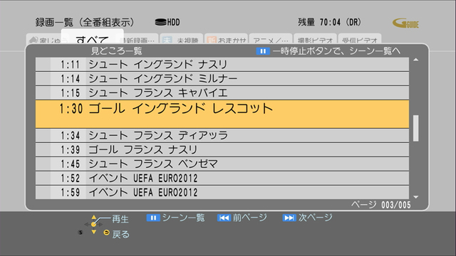 「見どころ一覧」を活用。サッカーの試合では試合中の見どころとなるプレイがピックアップ。ゴールのほかシュート、カードなども一発でアクセス。