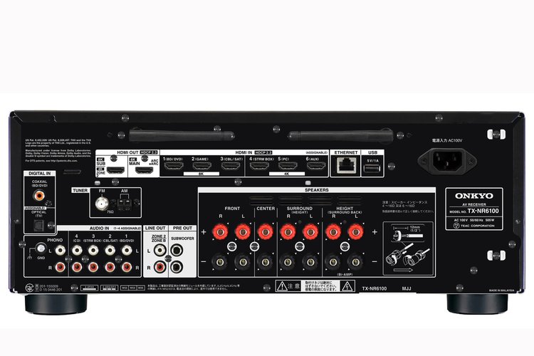 TX-NR6100の背面部。電源ケーブルは着脱に対応。HDMI出力を2系統搭載し、eARC対応の出力を1系統備える