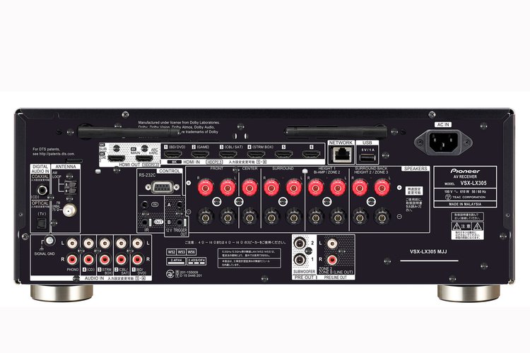 VSX-LX305の背面部。電源ケーブルは着脱に対応。HDMI出力を2系統備え、そのうち1系統がeARCに対応する