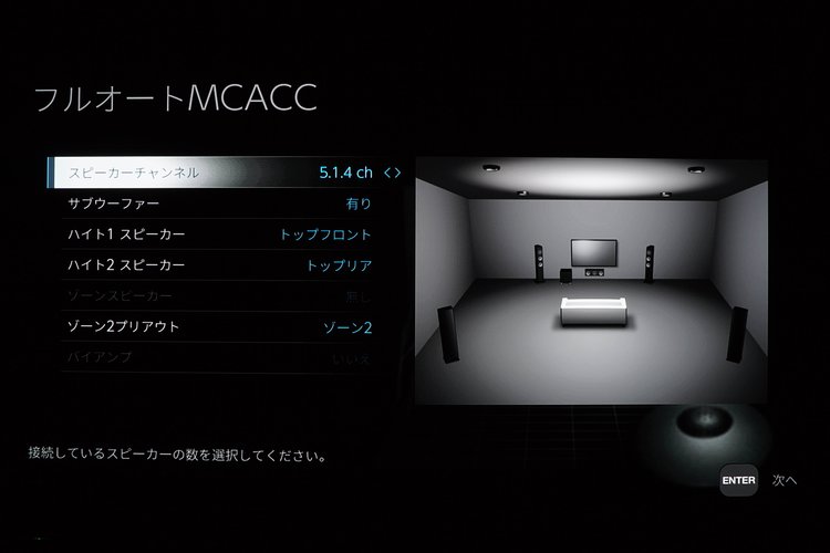 VSX-LX305の自動音場補正/スピーカー設定の画面。。内部アンプのみでは5.2.4chシステムを構築可能